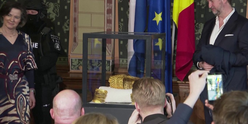 Dutch authorities on Thursday showed off a recovered priceless gold 2,500-year-old helmet from Romania that was stolen last year during a brazen heist in the Netherlands. Flanked by balaclava-clad police officers, a spokesman for Dutch prosecutors unveiled the 5th-century BC golden Helmet of Cotofenesti and two of the three gold bracelets stolen in January 2025. The theft had sparked outrage in Romania and prompted a huge police search.