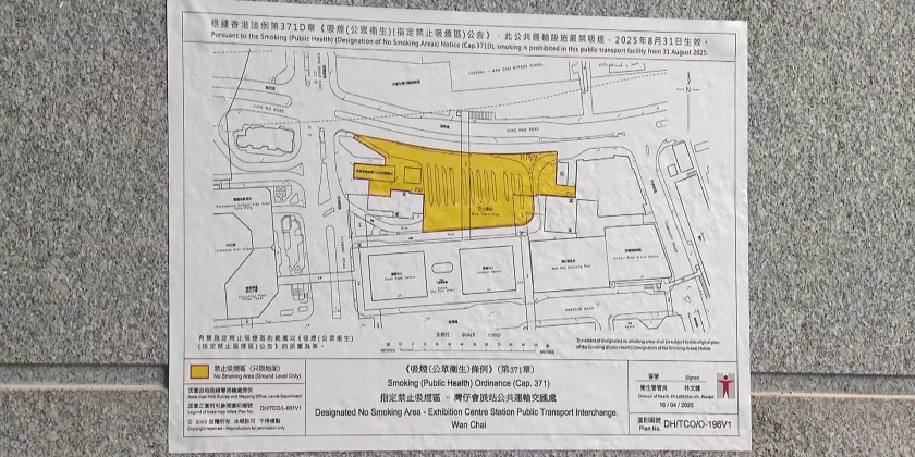 A map on the wall shows that the smoke-free area covers the entire bus terminal as well as the entrances and exits of the MTR station. The extension of no-smoking areas aims to protect the public from second-hand smoke and discourage smoking.