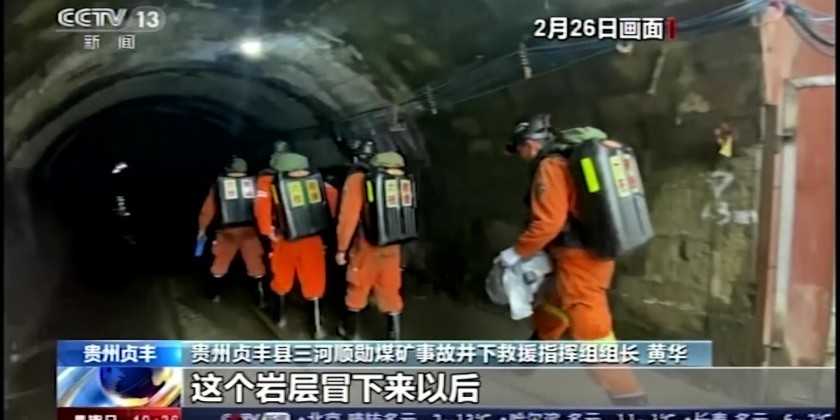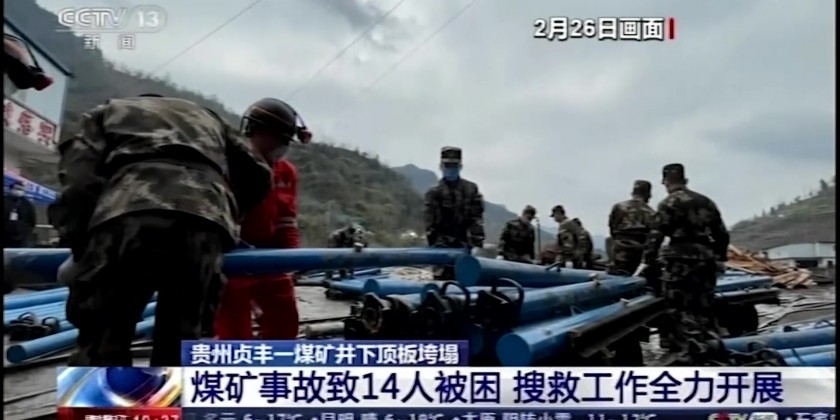 A coal mine collapse in southwestern China has trapped 14 miners. The location where the roof collapse occurred is 3 kilometers away from the mine entrance, and the area of the collapse is large, which poses considerable difficulty to the rescue work. The trapped people were in the middle section of the collapse - approximately 75 meters from the mine entrance.