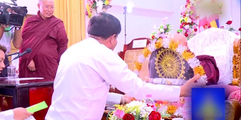 The Chief Minister paid homage to the Sitagu Sayadaw and offered offertories and cash donations to the Dhamma School Foundation. The ceremony opened with the three-time recitation of Namotasa. The congregation then listened to Ovada Gatha delivered by the Sitagu Sayadaw and Sayadaws from the State Sangha Maha Nayaka Committee, State Pariyatti Sasana University (Yangon) and Yangon Region Sangha Nayaka Committee, as well as the Dhamma School Foundation (Central). This was followed by the supplication of Dhamma school activities and religious matters.