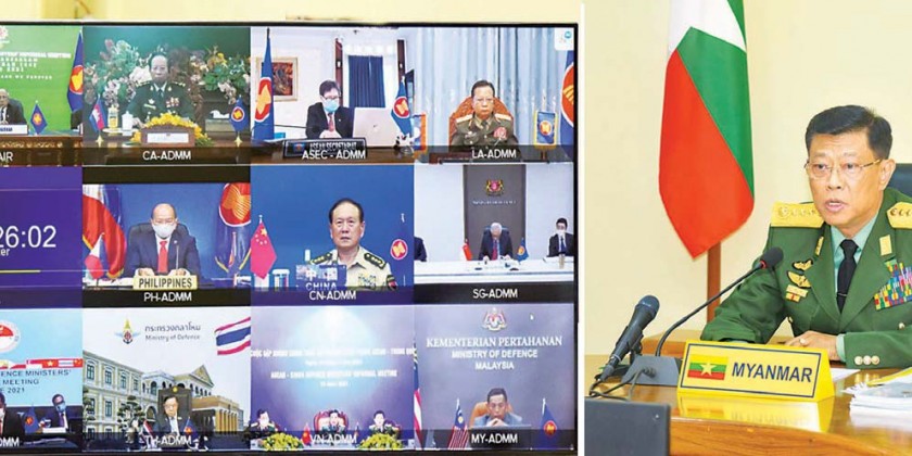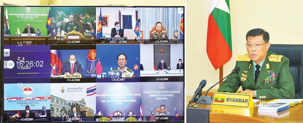 The member of State Administration Council, Union Minister for Defense General Mya Tun Oo, director general of the department of international and internal affairs Colonel Nyein Chan and officials attended the 15th ASEAN Defence Ministers’ Meeting (15th ADMM) hosted by the Brunei Darussalam, the rotating chairmanship of ASEAN via Video Conferencing at the meeting hall of the ministry, Nay Pyi Taw on 15th June.