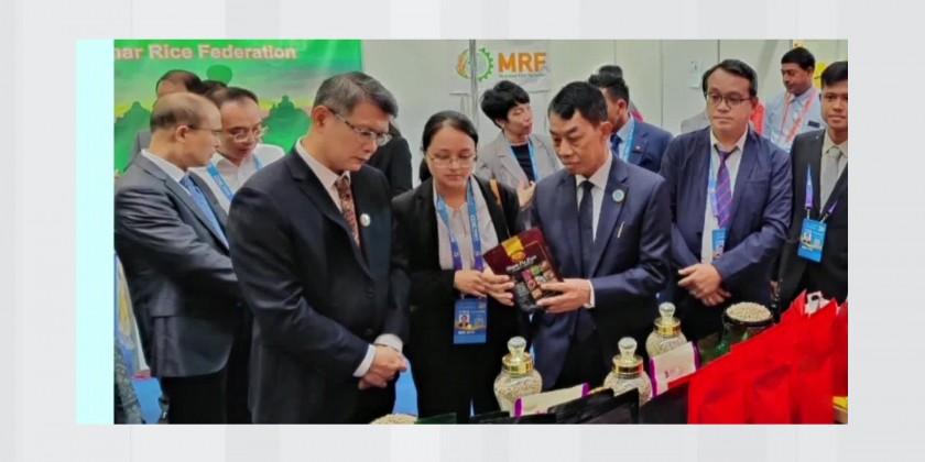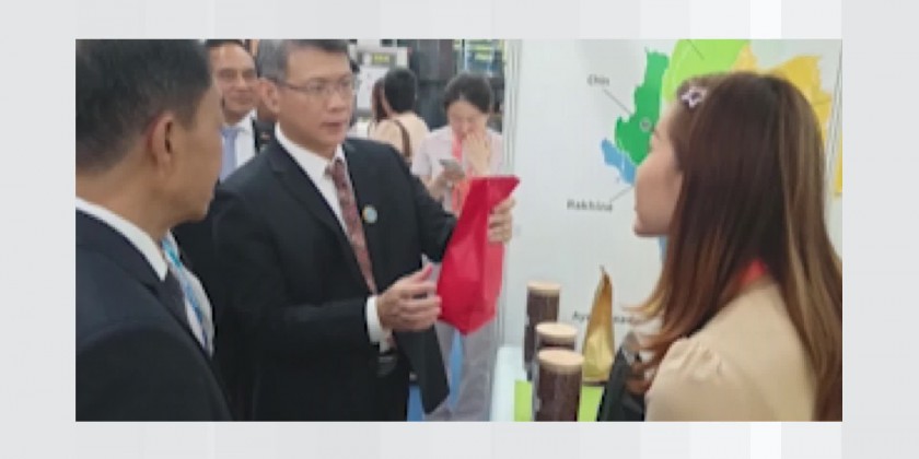 Then, the Union Minister and party oversaw the products booths displayed by Myanmar entrepreneurs. 84 booths from Myanmar are participating in the expo, displaying the various items including agricultural products, marine products, handicrafts, gems and jewellery.