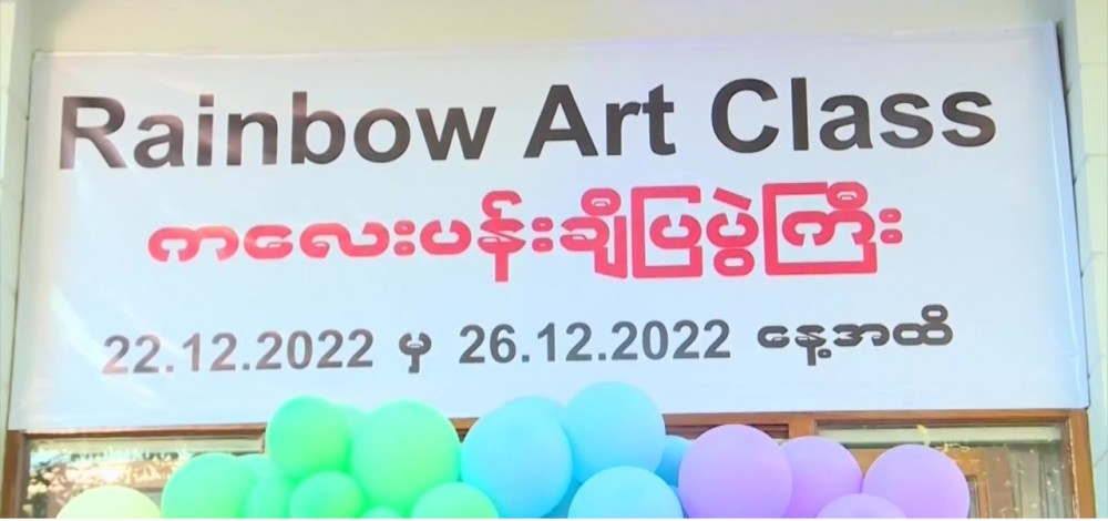 Zaw Myint Lwin (Saya Pachi), Rainbow Art Class said "In this Rainbow Art Class, children at the age between 7 and 12 create their paintings. Here, we conduct the training for watercolor painting for 2 months and acrylic painting for 4 months. In this summer, a total of 50 children joined the art class and among them I choose 20. After that, I have trained them for 6 months to showcase their creations at the Golden Art Valley. I want to invite everyone to enjoy the creations of my trainees. "