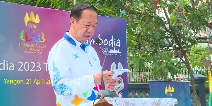 The torch flame arrived Yangon on 19th April, and the Torch Relay Ceremony was at the Royal Embassy of Cambodia to Myanmar on Friday, with the attendance of Union Minister for Sports and Youth Affairs U Min Thein Zan.