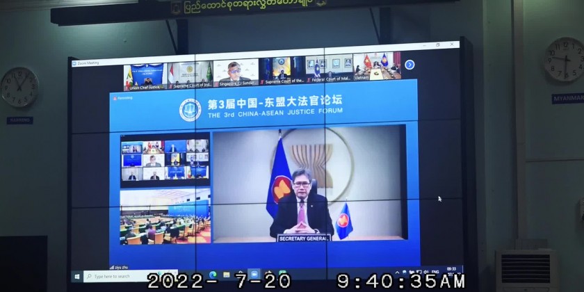 In order to better facilitate the development of the China-ASEAN Comprehensive Strategic Partnership and further enhance judicial exchanges and cooperation between China and ASEAN countries, the 3rd China-ASEAN Justice Forum was held in Nanning, Guangxi Zhuang Autonomous Region of the People’s Republic of China in both online and offline on 20thJuly. Union Chief Justice U Htun Htun Oo attended the Forum through video conferencingfrom the Supreme Court of the Union in NayPyi Taw.