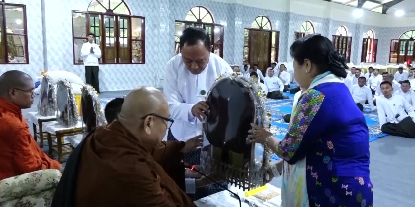 To conclude the ceremony, the Union Minister, Deputy Minister, awardees, donors, and staff took a group commemorative photograph. The Ministry also performed the observing precepts, taking Paritta Suttas, donating offertories, sharing merits and offering morning meal to the members of Sangha at Thiri-Gandama-Thabyayaye Moe-Goke Vipassana monastery in the morning on the same day commemorating the 4th Anniversary of the Ministry.