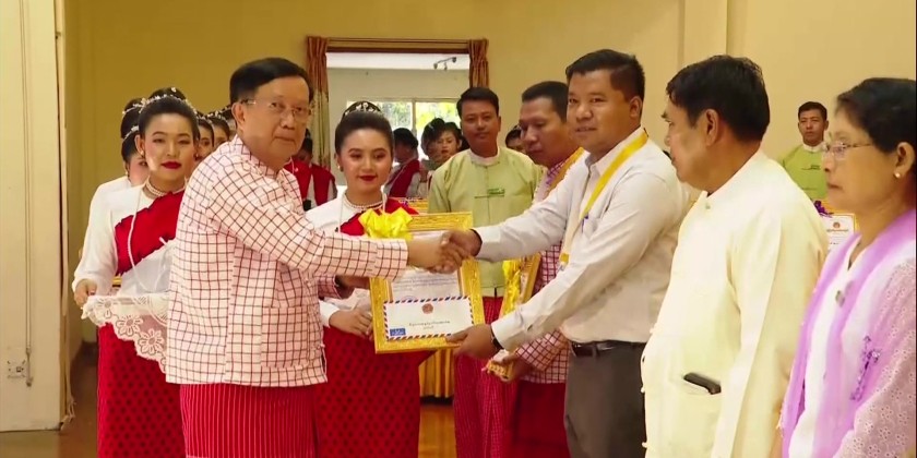 Following this, General Aung Lin Dwe and council members presented awards to recipients of the State Outstanding Honorary Awards, followed by a group photo session with the awardees.