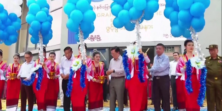 In the afternoon, General Aung Lin Dwe and party attended the opening ceremony of the Myaing Yatana Five-Storey Market (Grand Mawlamyine Shopping Mall) in Phat Tan Ward, Mawlamyine, as part of the Mon State Day celebrations. They officially opened the market by cutting the ribbon and toured the premises.
