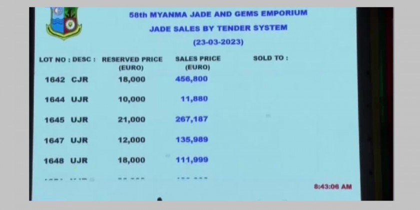 Organized by the Ministry of Natural Resources and Environmental Conservation, the 58th Myanmar Gems Emporium is being held at the Mani Yadana Jade Hall in Nay Pyi Taw from 17th to 23rd March. 2,150 jade lots were put on sale from 21st to 22ndMarch and 1,114 jade lots were sold out and the remaining 650 Jade lots are put on sale on 23rd March.