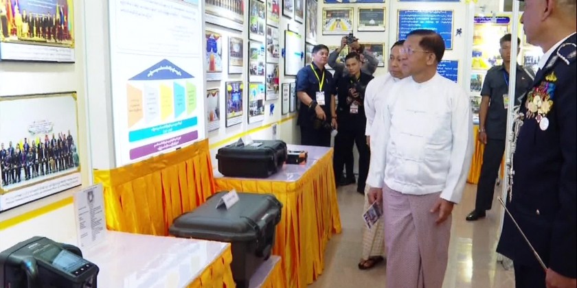 Then, the Senior General had a documentary photo taken with the attendees, cordially greeted the attendees and viewed the items in exhibition booth displayed to mark the 60th Anniversary of Myanmar Police Force Day.