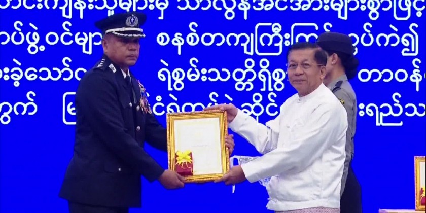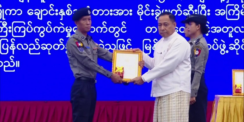 Then, the video clip of the anniversary of 60th Myanmar Police Force was shown.After that, the Senior General presented awards and orders to four MPF members, Council Joint-Secretary General Ye Win Oo to three MPF members and the Union Minister for Home Affairs Lt-Gen Yar Pyae to three members of MPF.