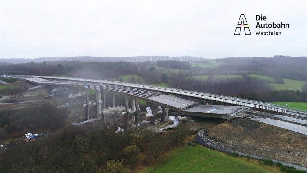 A 485-metre-long and 70-metre-high old Autobahn bridge was brought down near Wilnsdorf, in the western German state of North Rhine-Westphalia, on Sunday. It is the first time an Autobahn bridge this high has been demolished, according to the government infrastructure operator. The 55-year-old structure near the Hessian state border collapsed as planned at 1100 local time with the help of 120 kilogrammes of explosives. The bridge's 16 piers fell to the ground along with the road surface.