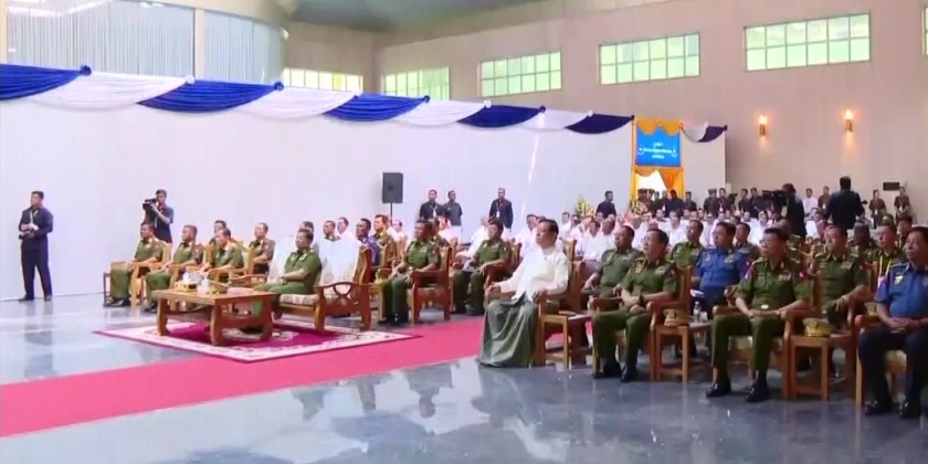 After the ceremonial ribbon cutting to formally open the event, the Senior General unveiled the signboard of the 75th Anniversary Diamond Jubilee of Defence Indistries Day. Following this, the Senior General made a speech, saying that the history of defence industries dated back in the late Konebaung Era, with an efforts of Crown Prince Kanaung for establishment of defence industries to counter the intrusion of British.
