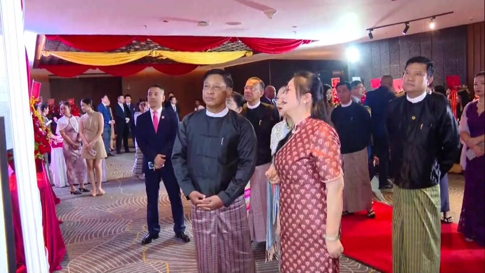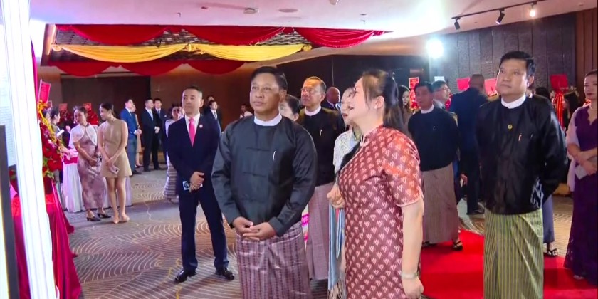 Union Minister for the Ministry (1) of the President’s Office U Tin Aung San and his wife attended the event. First, Chinese Ambassador to Myanmar Ms. Ma Jia and officials warmly welcomed the Union Minister U Tin Aung San, his wife, and other attendees to the event and accompanied them to view photographic exhibits documenting the history of China.