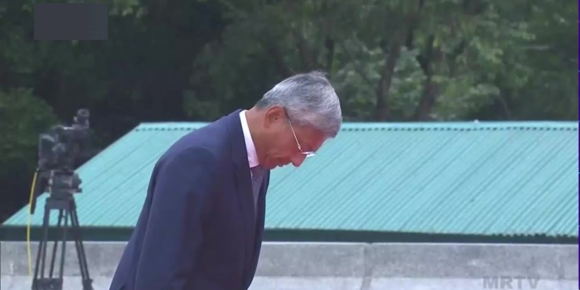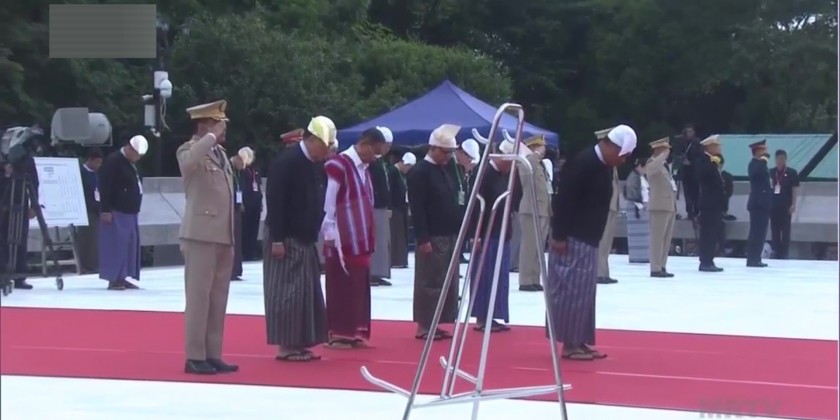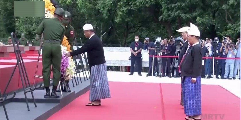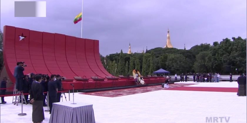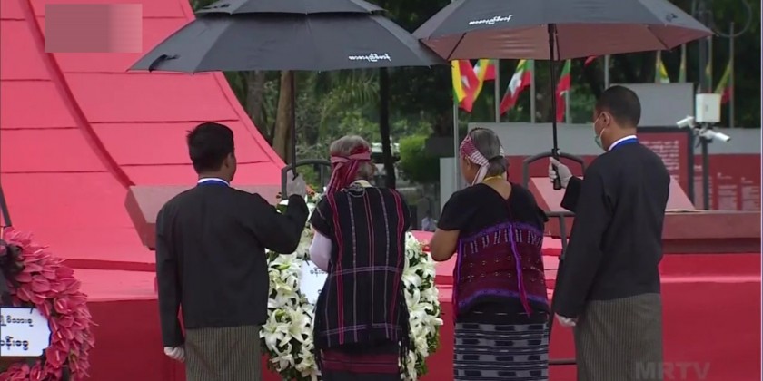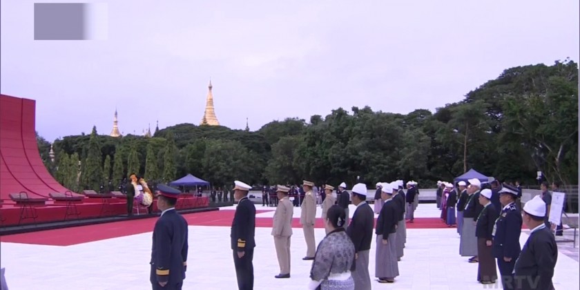Meanwhile, the Flag of the Republic of the Union of Myanmar was lowered to half-mast. The Guard of Honour presented arms and the military bugle sounded the last post, and then they observed a two-minute silence in remembrance of fallen martyrs leaders.