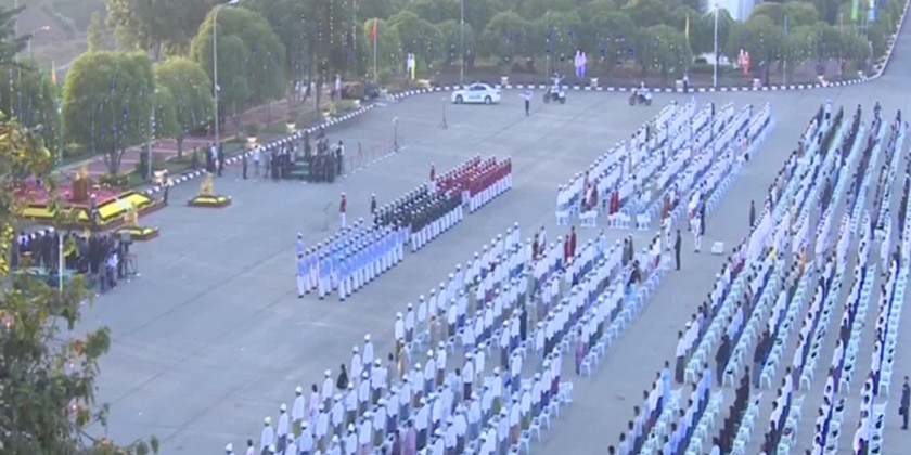 The flag hoisting platoon raised the State Flag at 4:20 am together with the ethnic races. The ceremony was organized with five national objectives of the 76th Anniversary of Independence Day – (1) To uphold “Our Three Main National Causes” — Non-disintegration of the Union, Non-disintegration of national solidarity and Perpetuation of sovereignty, which are national interests and national politics (2) To ensure the promotion of a comprehensive education sector that produces human resources with perfect abilities like intelligence, skills, and talents in building a Union based on democracy and federalism (3) To make efforts to hold free and fair elections under the law and ensure the right to vote across the nation (4) To foster public cooperation for state stability and strengthen the multiparty democratic system at the end of acts of terrorism (5) To promote agriculture and livestock-based MSMEs.