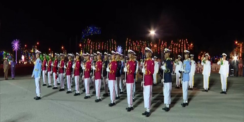 At 7 am, the flag saluting ceremony was organized and the Guard of Honour (Tatmadaw Army, Navy and Air) marched to the City Square.