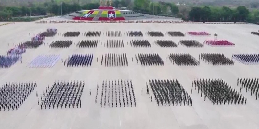Officers and other ranks from Tatmadaw (Army, Navy and Air) and Myanmar Police Forces, female members, members of Navy Seals, the female members of special operation task forces, troop of heavy machinery corps from the Tatmadaw (Army and Navy) and aircrafts from the Tatmadaw (Air) participated in the parade together with airplanes and helicopters from the Tatmadaw (Air).