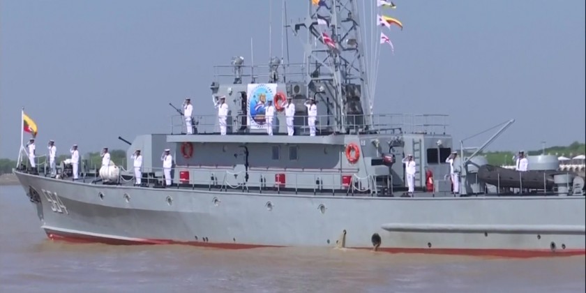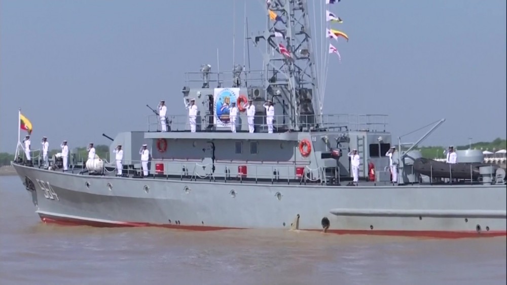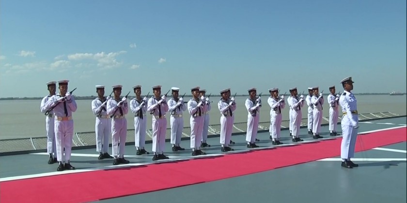 The submarine Minye Kyaw Htin, the frigate Aung Zeya leading the frigates Kyansittha and Sin Phyu Shin, the corvette Tabinshwehti, the offshore patrol vessel Inlay and the anti-submarine warfare vessels Yan Nyein Aung and Yan Ye Aung maneuvered in Single Line Formation and Line Abreast Formation, rendering honors as they sailed past.