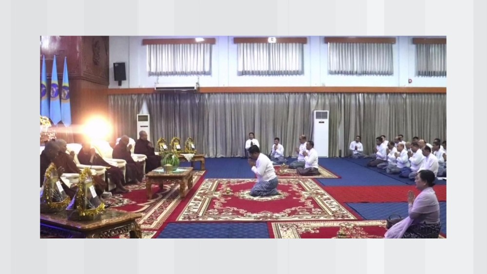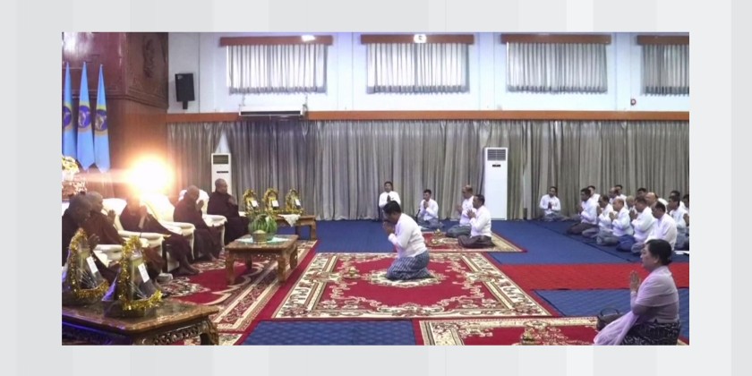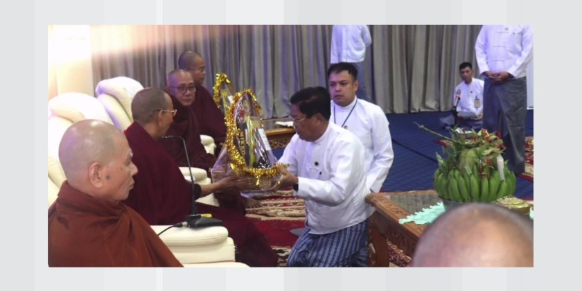 Merits accumulated from all the donations were shared by pouring water, and the monks recited Paritta Suttas and offered blessings. Breakfast was served to the attending guests. Following this, an award presenting ceremony was held to honor staff members who had excelled in training courses conducted at the Civil Services Academies (Upper Myanmar and Lower Myanmar) as well as those who had won prizes in various events during the December sports competitions held within the ministry.