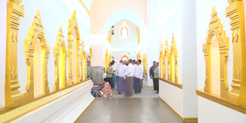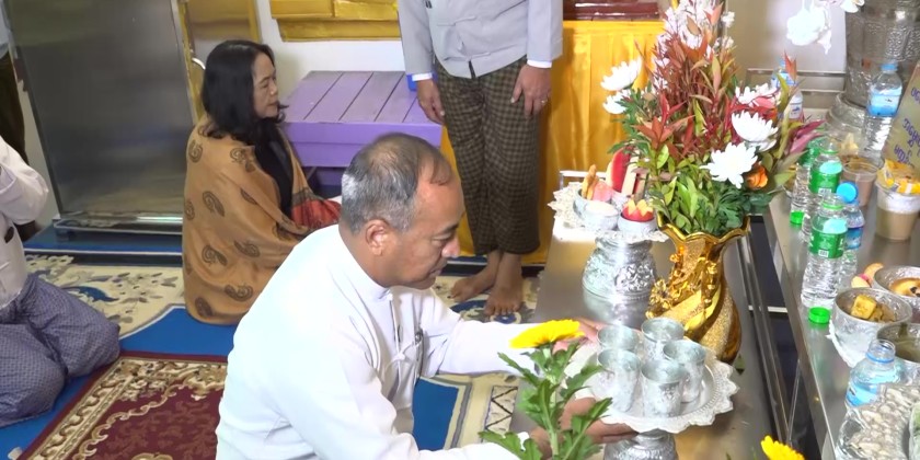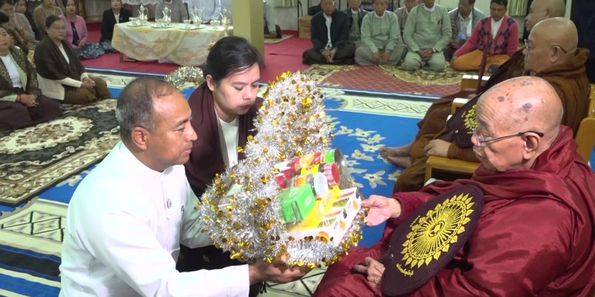 First, the Shan State Chief Minister U Aung Aung, offered flowers, water, alms, and oil lamps to the Buddha image in the Dhamma Hall of the Sula Muni Loka-Chantha Pagoda. Then, the Chief Minister and his wife, the State Chief Justice and his wife, State Ministers, the State Advocate General, and other responsible officials offered the morning meal to the presiding Sayadaw and members of the Sangha.