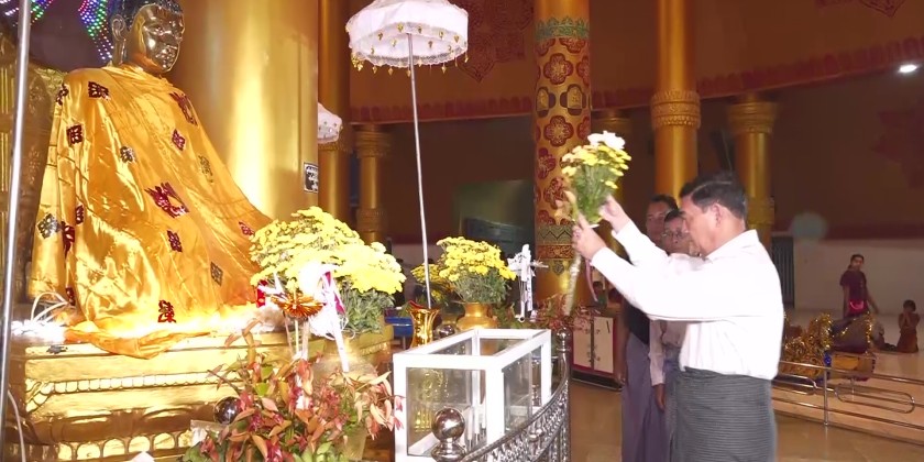 First, the Chief Minister and his wife, along with members of the State Government, paid homage and respectfully offered flowers, water, and oil lamps to the Buddha images inside the Lokananda Pagoda.