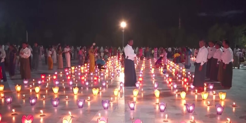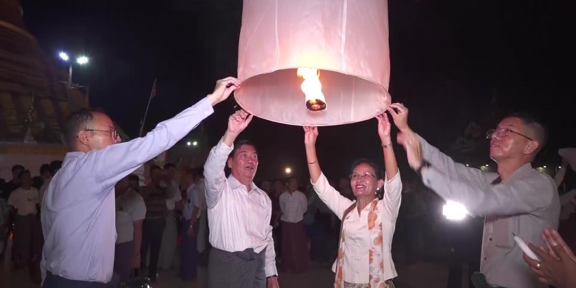 The Rakhine State Government organized the Full Moon Day of Thadingyut (Abhidhamma Day) oil lamp offering ceremony and hot air balloons releasing event on the evening of October 6th in Sittwe, at the Lawkananda Pagoda, Atula Marazain Pyilone Chanthar Pagoda, and Yanpye Manpye Pagoda. The Chief Minister of Rakhine State, U Htein Lin, and his wife, members of the State Government and their wives, departmental officials, teachers, students, and local residents attended the event.