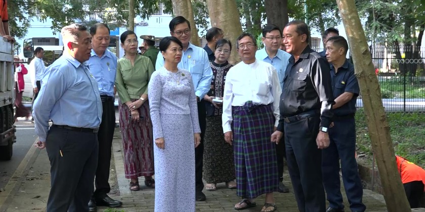 Union Minister for Education Dr Chaw Chaw Sein, together with officials, visited Yangon University on Saturday, to inspect ongoing campus cleanliness and beautification works. Yangon City Development Committee’s Deputy Mayor U Nyi Nyi and staff, along with university staff, were carrying out garbage cleaning, drainage clearing, and tree-pruning activities.