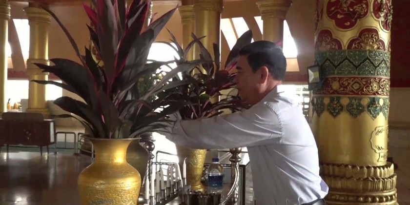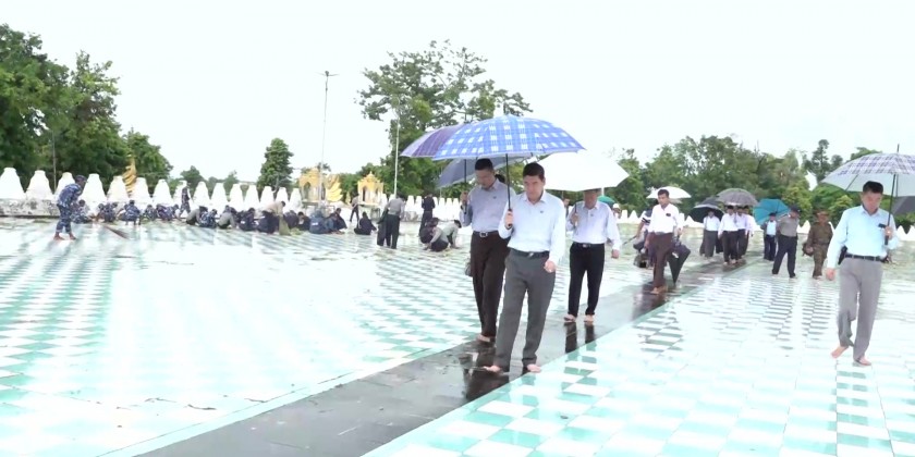 At the Lawkananda Pagoda, the Chief Minister offered flowers, oil lamp and water to the pagoda and viewed the cleaning activity on the pagoda platform by Tatmadawmen and members of the police force and fire brigade and coordinated the requirement.