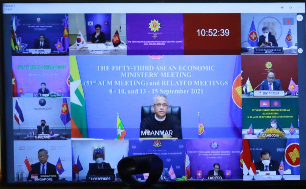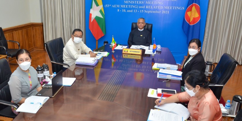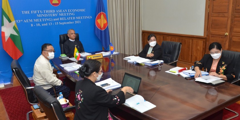 Union Minister for Investment and Foreign Economic Relations, U Aung Naing Oo participated in the 20th AEM-MOFCOM Consultations, 18th AEM-ROK Consultations, 13th Mekong-Japan Economic Ministers’ Meeting, AEM Troika Open-ended Dialogue with Switzerland Trade Minister and 24th AEM-Plus Three Consultations which were held via videoconferencing started at 7:00 am from the Ministry of Investment and Foreign Economic Relations, Nay Pyi Taw.