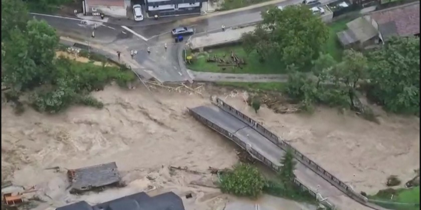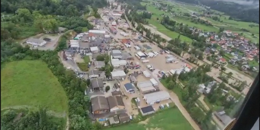 Aerial images posted on social media by the Slovenian police show flooding some 23 kilometres North of the capital Ljubljana following heavy rains. Three people have died after floods and landslides caused by the weather cut off access to villages and disrupted traffic in Northeastern and central Slovenia, according to the authorities. Slovenian Prime Minister Robert Golob called a crisis meeting to convene on Saturday to discuss the situation.