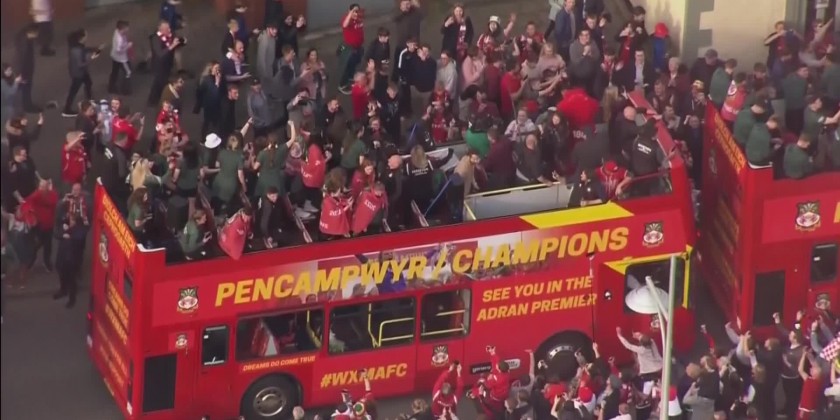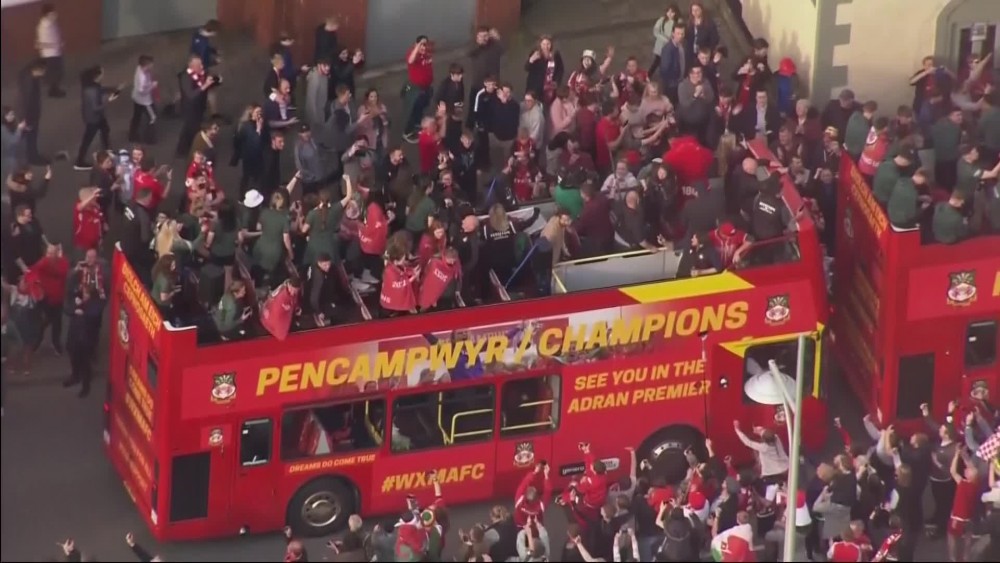 Supporters and players of Wrexham AFC celebrated its promotion to the fourth division of English soccer with an open top bus parade through the city on Tuesday.