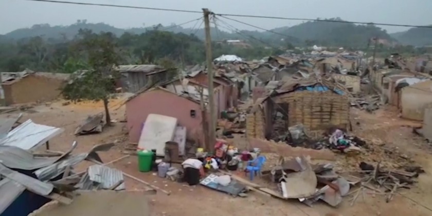 Dozens of houses and buildings were reduced to rubble when a vehicle carrying mining explosives blew up after colliding with a motorcycle in western Ghana, officials said. The crash happened Thursday in Apiate, a mining town in the Prestea-Huni Valley district.