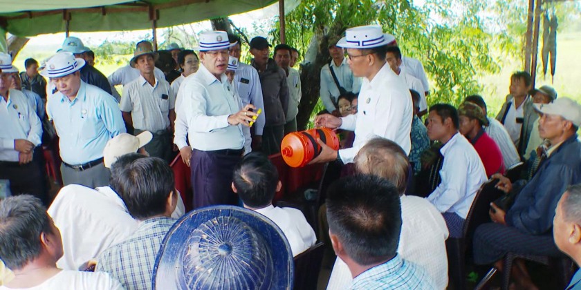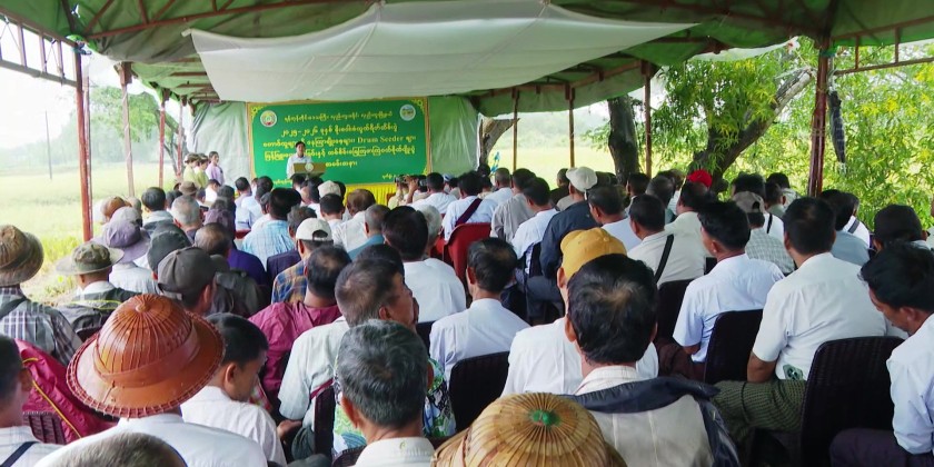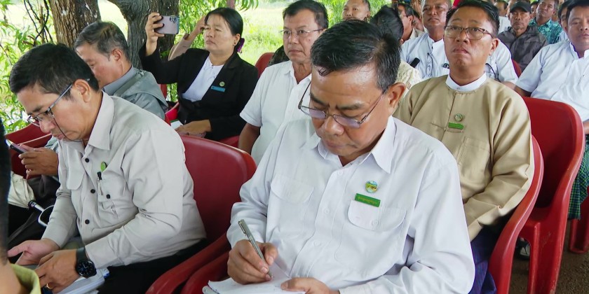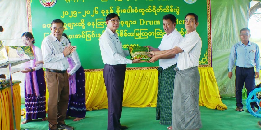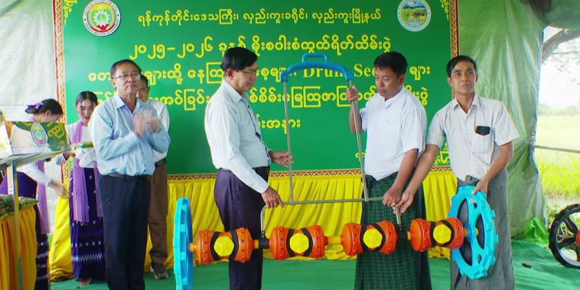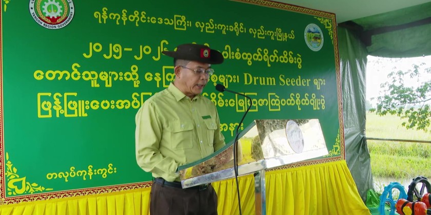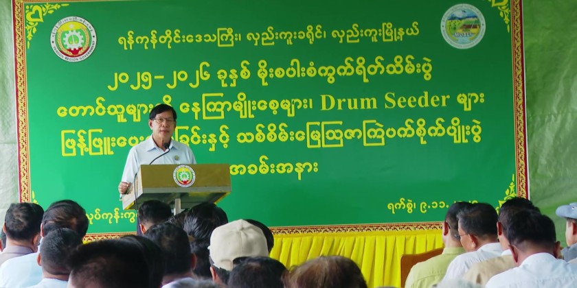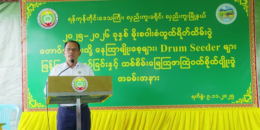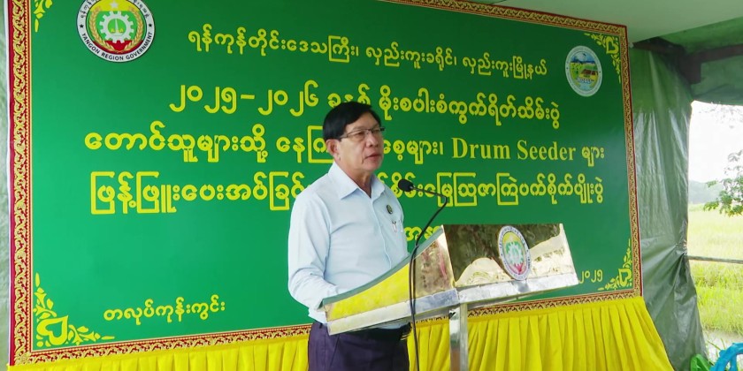 Chief Minister U Soe Thein attended the event and made a speech, highlighting the use of drum seeders that help farmers reduce labor costs, save time, and achieve better yields. He also emphasized the importance of water management for agricultural success.