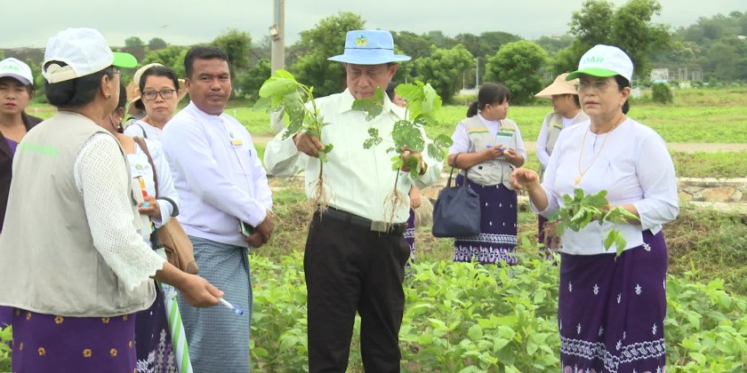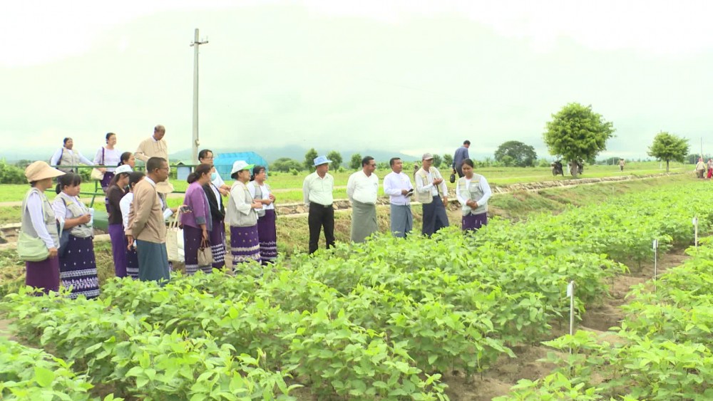 Deputy Minister for Agriculture, Livestock and Irrigation Dr. Tin Htut made a ground inspection of the rows of seed production soy bean plantation at the trial plot of various beans research unit under the Department of Agriculture in the morning on 17th July.