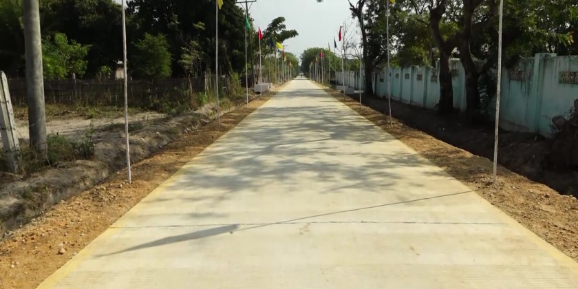 From there, in honor of the upcoming 79th Union Day, the Union Minister attended the opening ceremony of a new 2200-foot-long concrete road in Kyun Kone Village, Thaw Hmaw Kone Village Tract, Lewe Township, constructed with the Nay Pyi Taw Council's allocated funds for the 2025-26 fiscal year.