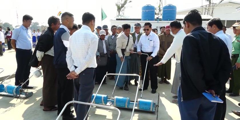 First, Union Minister U Hla Moe, Nay Pyi Taw Council Chairman, and officials cut the ribbon to open the sales gallery and workshop, followed by the taking of a group commemorative photograph. Subsequently, in his opening remarks, the Union Minister stated that the development of basic agricultural mechanization industries greatly contributes to the development of cooperative businesses, the eradication of poverty, the increase of job opportunities, and the reduction of labor migration to urban areas and foreign countries for work.