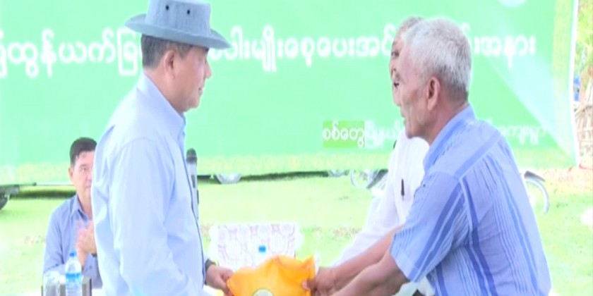 Next, the Union Ministers, chief minister and deputy minister provided Hsin Thwe Latt rice seeds and GW-11 rice seeds produced by the seeds division of agriculture department for the farmers in Pyar Lae Chaung Village and one of local farmers extended words of thanks.