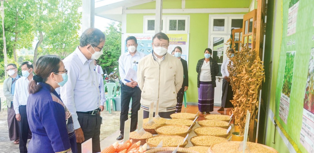 The Union Minister inspected the sample corn, fermented soya-bean and edible crops of Aungpan Agriculture Research Station and instructed to grow new crops for commercial purposes and expand the research works based on the market. Then the Union Minister discussed about the preparations of Irrigation and Water Utilization Management Department to prevent the silting in Inlay Lake of Shan State, the use of silt scavenged annually in farming sector, production of fertilizer using the collected duckweed, water hyacinth and flotsam and cooperation works between the government and private organizations to expand the tomato and vegetable cultivations in line with the GAP on floating fields.