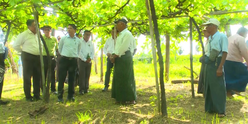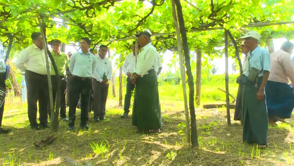 Union Minister for Agriculture, Livestock and Irrigation U Min Naung visited the vineyards in YwarTan village-tract on Yamethin Township in Mandalay Region on Sunday. During the meeting with farmers, the Union Minister urged them to cultivate grape not only for consuming but also for wine producing.