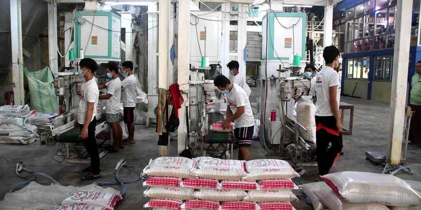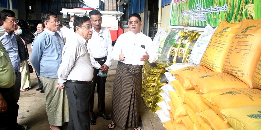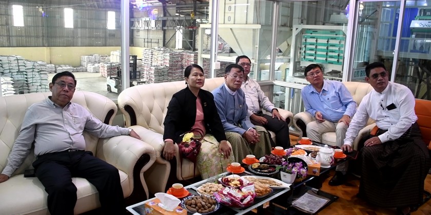 The Chief Minister and party visited the OK Yadana Rice Mill in Kyauk Phyar Village. During the visit, they were briefed on the mill's operation process and distribution in the region.