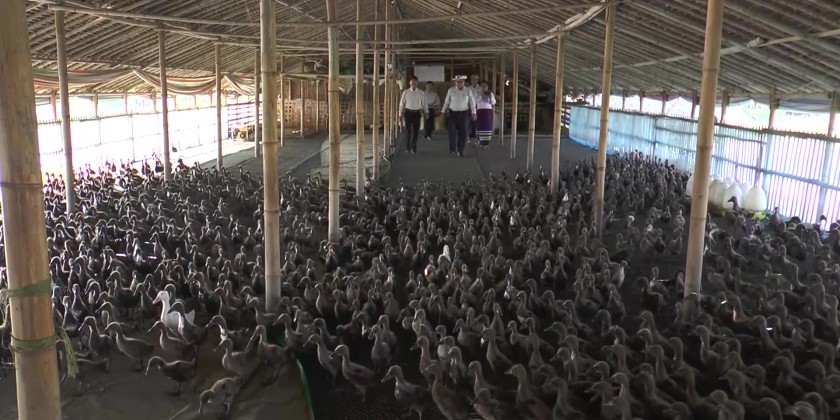Deputy Minister for Agriculture, Livestock and Irrigation Dr. Aung Gyi inspected the egg-laying duck breeding farm and the distribution of ducklings in Pule Village, Phyapon Township, Ayeyawaddy Region.