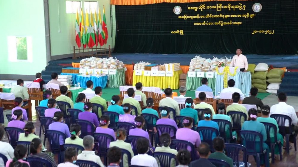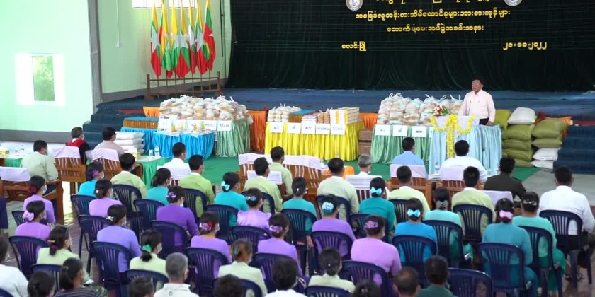 Chief Minister U Tint Lwin and many other officials joined this event at the township stadium which began with a speech from the Chief Minister stressing the government’s efforts to provide aid to the public. And, such basic foodstuffs as rice, cooking oil, salt, bean and onion as well as masks were provided to the 700 households.