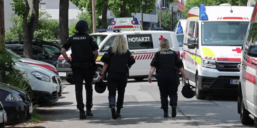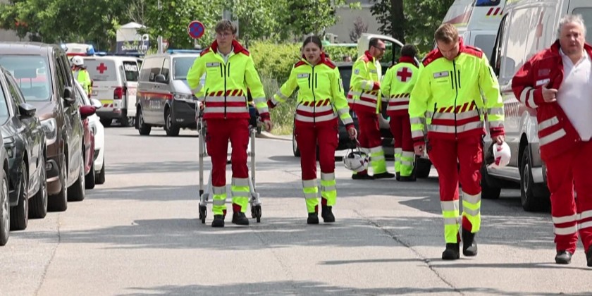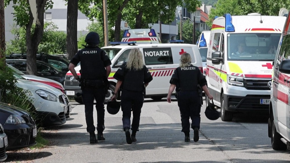 Emergency services work near the scene of a shooting at a school in the Austrian city of Graz, in which local authorities say 10 people were killed. According to local mayor, several students and at least one adult, as well as the suspected shooter, were among the dead.