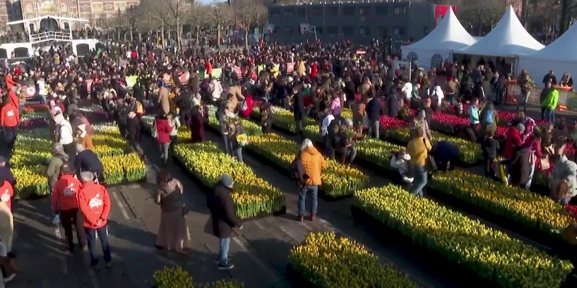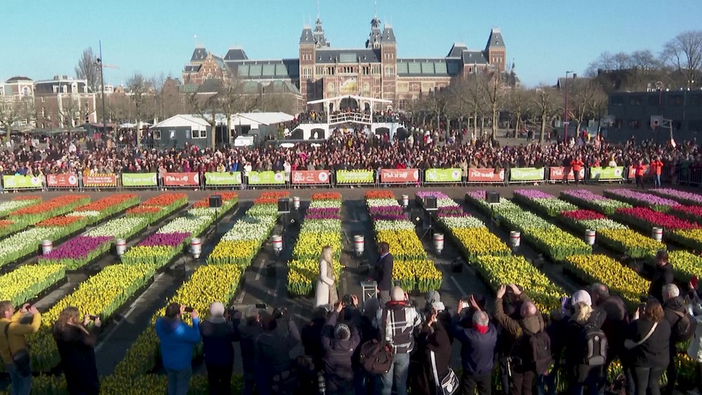 The Netherlands' National Tulip Day was celebrated in Amsterdam on Saturday as the production of tulips continues at full speed ahead of the season. As part of the annual event, a picking garden with 200,000 tulips was created in the Museumplein garden.