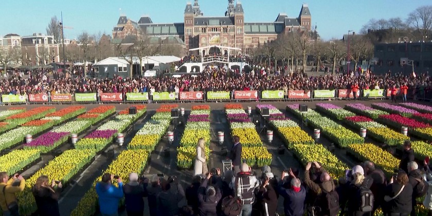 The event started with a fire display, while thousands of visitors were waiting to pick up free tulips. The Netherlands is the world's biggest tulip producer. Over the season, Dutch producers grow between 1.7 and 1.9 billion tulips, which are exported to more than 100 countries worldwide.