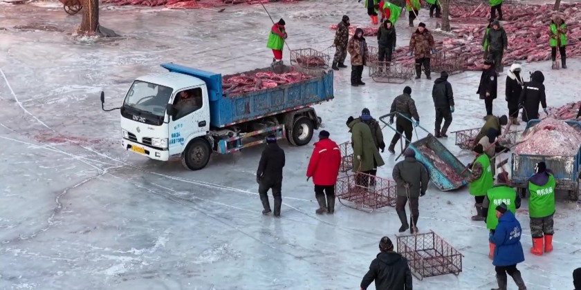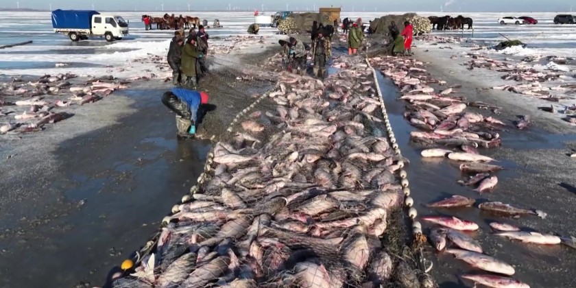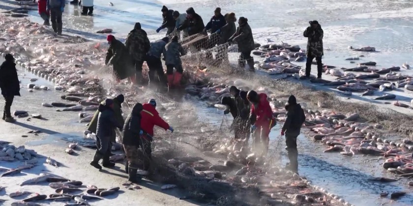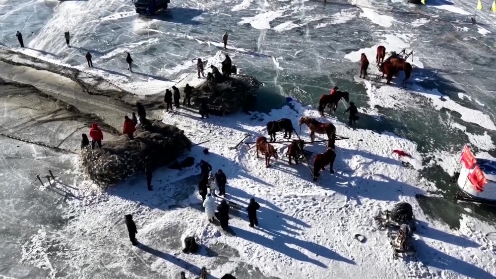 As the annual winter fishing event heats up at the Chagan Lake in northeast China’s Jilin Province, fishermen have welcomed the season’s first “red net”, which means a haul exceeding 50,000 kilograms in a single net.