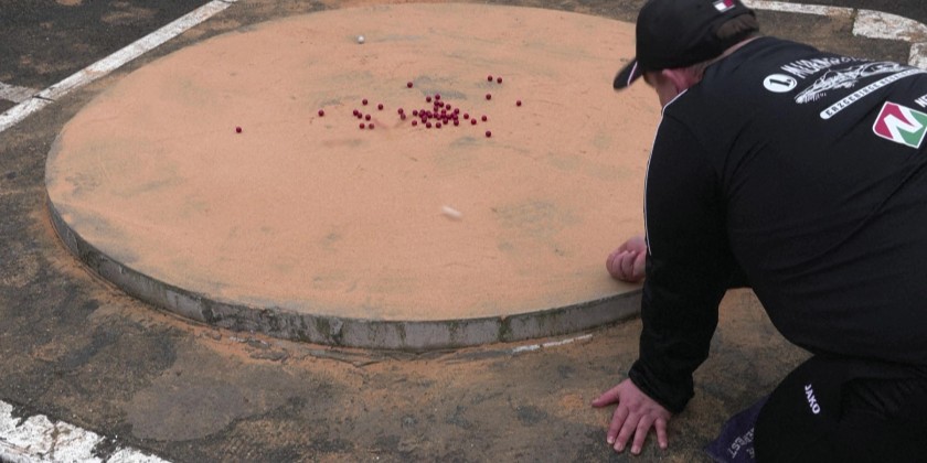 The game works with 49 target marbles grouped closely together in a 6ft raised concrete ring covered with sand. In the competition, two teams of six players have to take turns using the tip of the finger to aim and project a larger marble to drive the other marbles out of the ring. The first team to knock 25 marbles out of the ring is the winner.