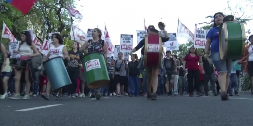 Chileans and Argentines took to the streets in capital Buenos Aires to protest against Chile's government on Tuesday. Demonstrators marched down the street close to Buenos Aires' central Obelisk banging drums and holding up banners against the government of Chile's Sebastian Pinera. Pinera has rejected the notion of resigning and believes he will reach the end of his term in just over two years despite intense anti-government protests that are roiling the country.