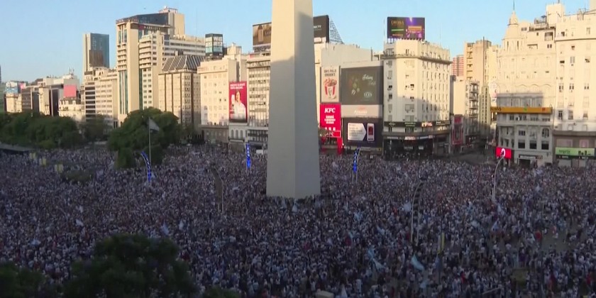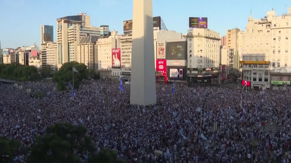 The crowd filled the street at the Obelisk monument.Hopes are high for the Argentines, who have long hailed their world star Lionel Messi to lead the team into the finals, and bringing a third title since the 1978 and 1986 championships.The other contender for the championship will be decided when France face Morocco.